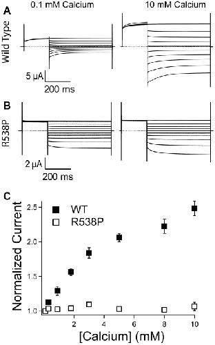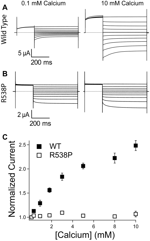 Figure 3. R538P abolishes calcium activation in hClC-Kb.Current recordings for (A) wild type and (B) R538P ClC-Kb channels at 0.1 mM calcium (left) and 10.0 mM calcium (right). (C) Calcium dependent activation of wild type (filled squares) and R538P (open squares) channels. Steady-state current levels at +60 mV plotted as a function of [Ca2+], normalized to the value at 0.1 mM calcium. Each data point is the average of several (n = 4–6) oocytes and error bars show the s.e.m. Only oocytes that showed reversibility were included in the analysis.