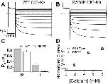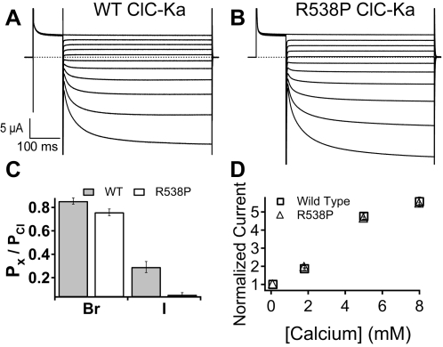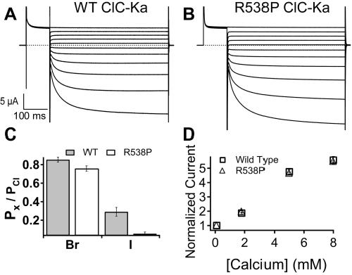 Figure 4. Expression of hClC-Ka-R538P.Two-electrode voltage clamp current recordings of wild type (A) and R538P (B) expressing channels. Currents are in response to a 100-ms prepulse to +60 mV follow by 500-ms test pulses ranging from +60 mV to −140 mV in −20 mV steps. (C) Relative permeability ratios for ClC-Ka wild type (filled bars) and R538P (open bars) channels. The iodide/chloride permeability ratio of R538P is statistically different from that of wild type (p<0.02, n = 3 (WT) and n = 5 (R538P)). (D) Calcium dependence at +60 mV of wild type (open squares) and R538P (open triangles) normalized to the current at +60 mV in the presence of 0.1 mM calcium, as in Figure 3. Error bars for WT (n = 4) and R538P (n = 3) are the s.e.m.