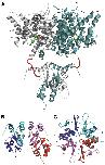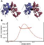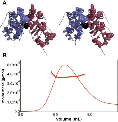 Figure 5. Dimerization of the ClC-Kb C-terminal domain.(A) Stereo view of the ClC-Ka cytoplasmic domain structure (2PFI) with amino acid differences between ClC-Ka and ClC-Kb shown in space fill. Amino acid F636 (shown in black) is on the dimer interface in ClC-Ka and when mutated to aspartic acid removes ClC-Ka dimerization. In ClC-Kb this residue is the non-polar residue serine. (B) Gel filtration combined with multi-angle light scattering shows that the C-terminal domain of ClC-Kb forms a dimer in solution. The solid line represents the absorbance at 280 nm as a function of elution volume. Filled circles represent the calculated mass at the different elution volumes. The molar mass was determined to be 37 kDa, consistent with dimerization.