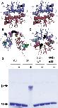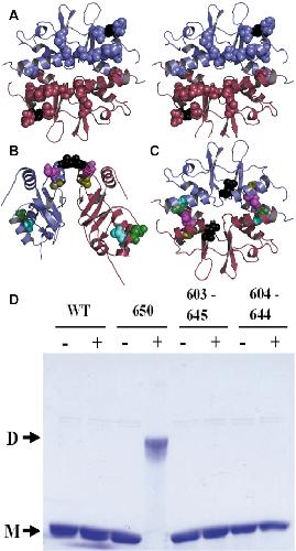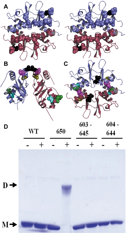 Figure 6. Conserved dimerization interface in the ClC-Kb C-terminal domain.(A) Stereo view of TM0935 structure (1O50), a CBSD-containing protein that adopts an alternate dimer interface. Amino acids corresponding to residues that differ between ClC-Ka and ClC-Kb are shown in spacefill. The residue corresponding to 636 in ClC-Kb (see Figure 5A) is shown in black. (B) Residues chosen for cross-linking studies mapped onto the ClC-Ka C-terminal domain structure: L650 (black), 603 (cyan), 604 (green), 644 (olive), 645 (magenta). For this dimer interface, the L650C mutant is expected to form an intersubunit cross-link. (C) Residues chosen for cross-linking studies mapped onto the TM0935 structure; color scheme as in B. For this dimer interface, the 603–645 and the 604–644 cysteine double mutants are expected to form intersubunit cross-links. (D) SDS-PAGE of purified ClC-Kb C-terminal domains with different cysteine mutations in reducing (−) and oxidizing (+) conditions.