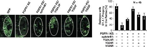 The Eph family of receptor tyrosine kinases and their membrane-bound ligands, the ephrins, have been implicated in regulating cell adhesion and migration during development by mediating cell-to-cell signaling events. The transmembrane ephrinB1 protein is a bidirectional signaling molecule that signals through its cytoplasmic domain to promote cellular movements into the eye field, whereas activation of the fibroblast growth factor receptor (FGFR) represses these movements and retinal fate. In Xenopus embryos, ephrinB1 plays a role in retinal progenitor cell movement into the eye field through an interaction with the scaffold protein Dishevelled (Dsh). However, the mechanism by which the FGFR may regulate this cell movement is unknown. Here, we present evidence that FGFR-induced repression of retinal fate is dependent upon phosphorylation within the intracellular domain of ephrinB1. We demonstrate that phosphorylation of tyrosines 324 and 325 disrupts the ephrinB1/Dsh interaction, thus modulating retinal progenitor movement that is dependent on the planar cell polarity pathway. These results provide mechanistic insight into how fibroblast growth factor signaling modulates ephrinB1 control of retinal progenitor movement within the eye field.