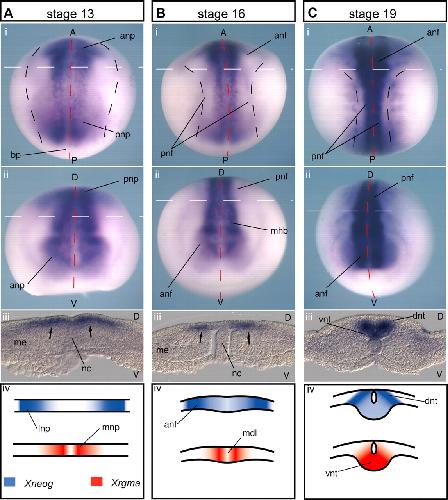 neural plate(anp)(Aii),(B) inthest16 posterior NFs(pnf)(Bi, Biii, arrows) and anterior NFs(anf)(Bii) with expression expanding