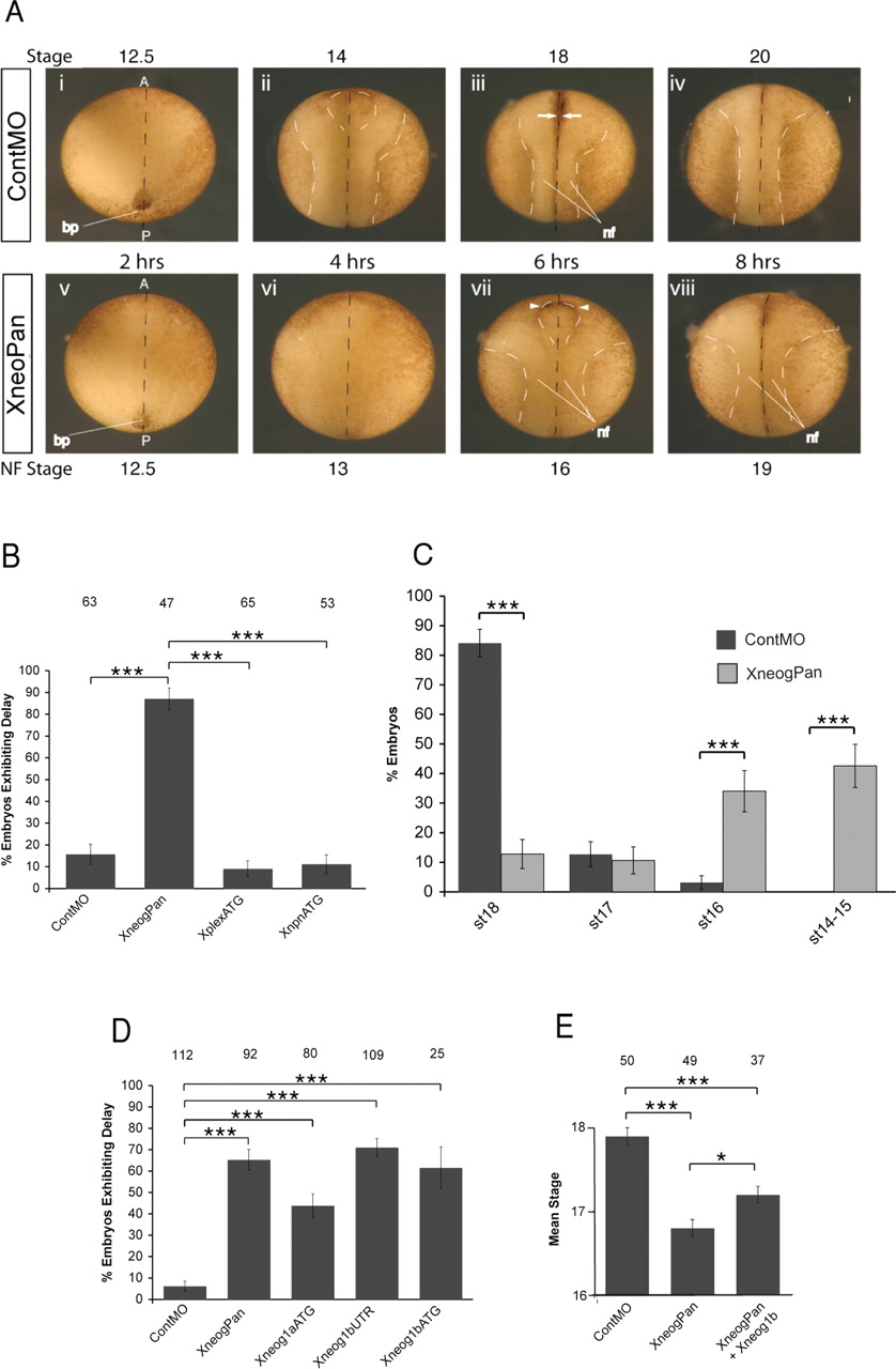 XplexATG MO or XnpnATG MO.C, Percentage of XneogPan-injected embryos at each stage of neurulation when 90% of ContMOinjected
