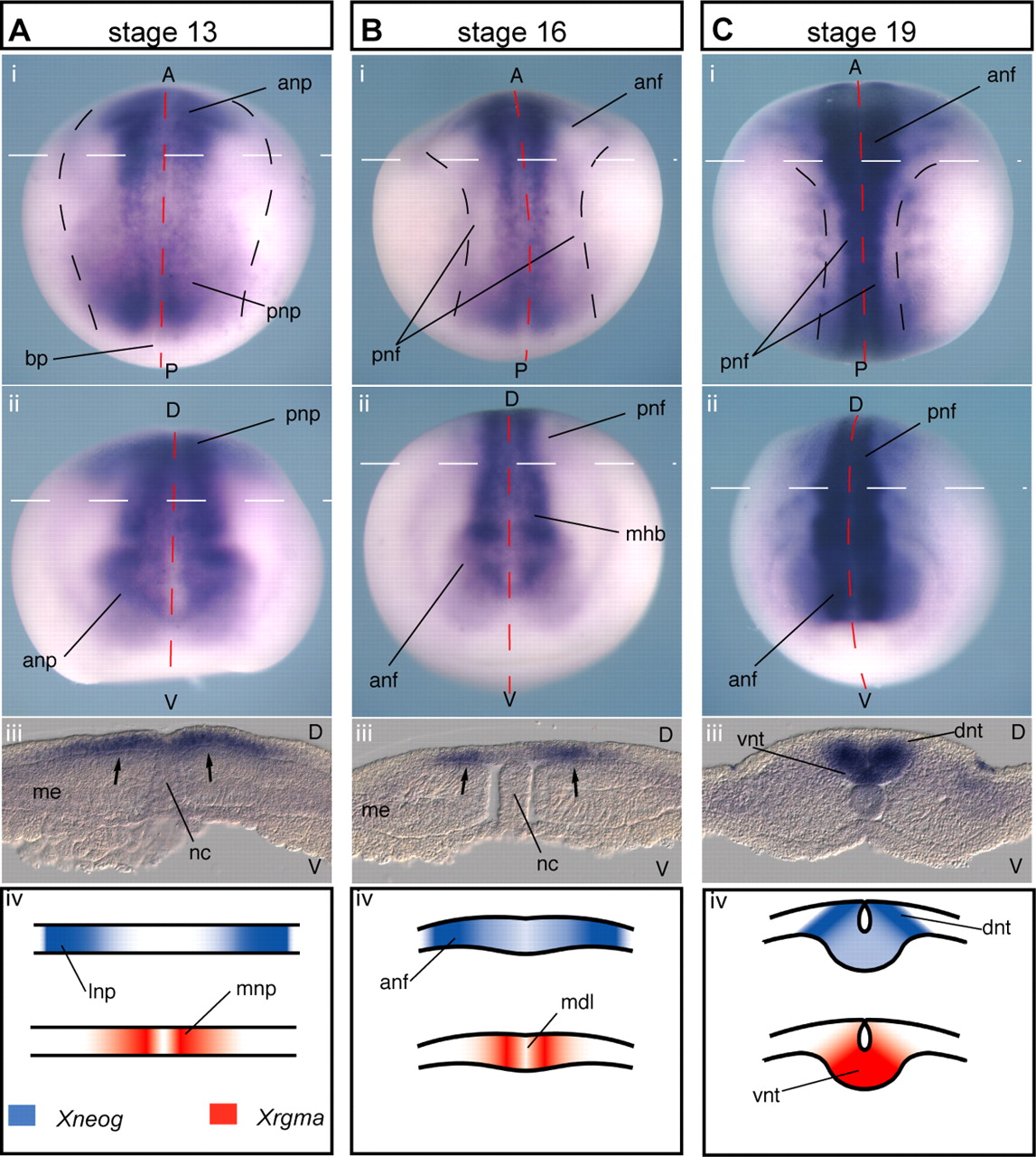 above panels; (iv), schematic of complementaryXneogandXrgmaexpression domains. lnp, Lateral neural plate; mdl, midline;