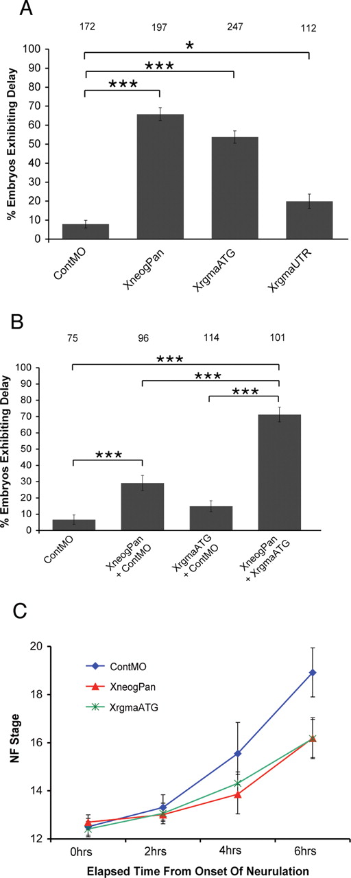 MO or XrgmaUTR MO produces a neurulation delay phenotype. B, Coinjection of 8 ng of
