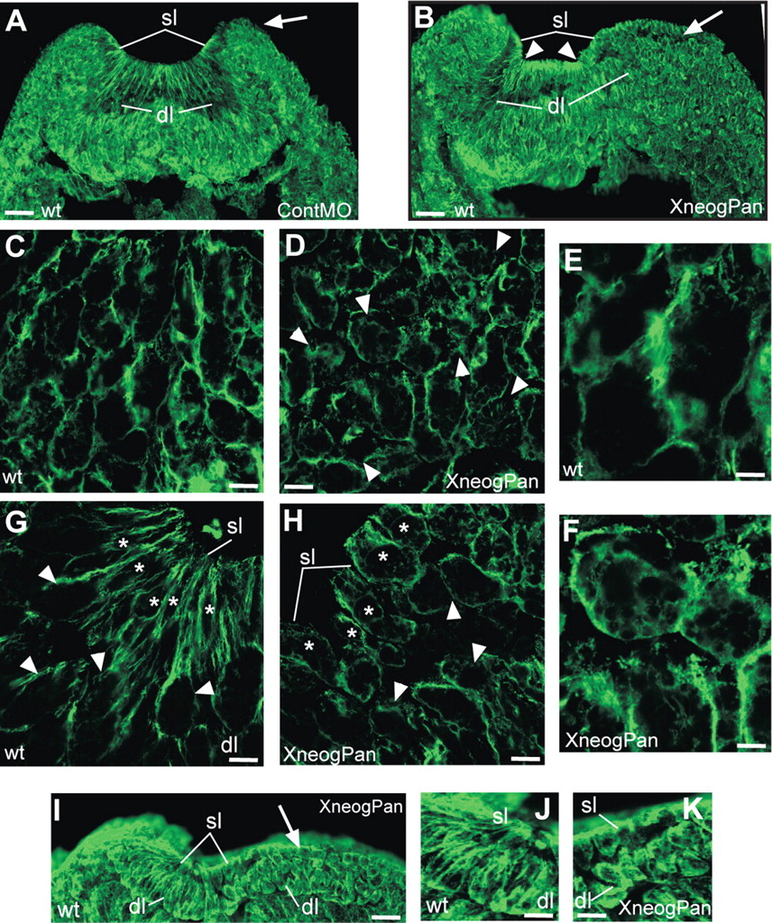 Figure 5. Loss of Xneog perturbs NF elevation and cell polarity. Transverse sections of st17 embryos immunostained with the