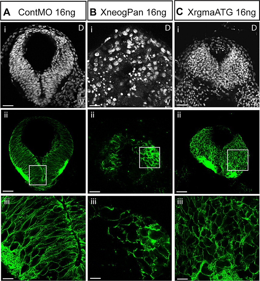 MO (B) or XrgmaATG MO (C) but not ContMO (A) disrupts the neuroepithelium of the neural tube. Aiii, Biii andCiii are higher