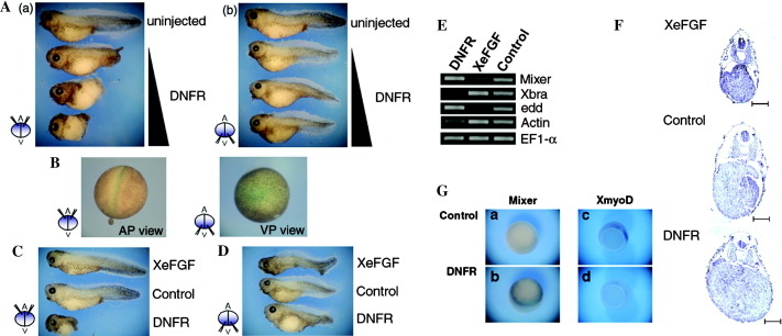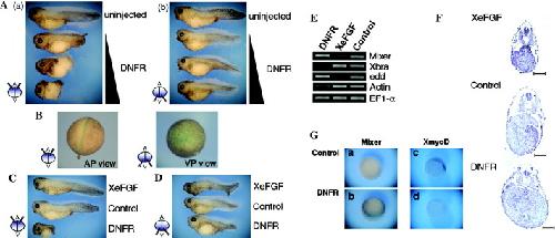 (A) Dose-dependent phenotype from injection of DNFR RNA in animal hemisphere (a) or vegetal hemisphere (b). The injection of DNFR RNA injected at varying concentrations into two-cell stage embryos and cultured until stage 34. (a) Animal hemisphere injected groups show a reduction of posterior structures and open neural tube defects in a dose-dependent fashion consistent with a previous report [22]. (b) In the vegetally injected groups, the abdominal structure was expanded with increasing doses of DNFR RNA. In contrast, mesoderm and dorsal structures were not significantly affected in this group. (B) β-Gal lineage trace of vegetal or animal pole-injected embryos. As expected, X-Gal staining was observed in the notochord region of embryos when β-Gal mRNA was injected into the animal pole, while X-Gal staining was localized within the abdominal region upon vegetal pole injection. (C) DNFR or XeFGF RNAs were injected into the animal hemisphere at the two-cell stage. An extended tail was observed in the XeFGF-injected embryos. DNFR-expressing embryos lacked most posterior structures. (D) DNFR or XeFGF RNAs were injected into the vegetal hemisphere at the two-cell stage. General ventral structures disappeared in the XeFGF RNA-injected embryos, while the DNFR RNA-injected embryos had expanded ventral structures. (E) RT-PCR analysis. In the XeFGF RNA-injected embryos, mesoderm markers were up-regulated and endoderm markers were down-regulated, and the reverse was true of DNFR-expressing embryos. The results suggest that FGF signaling may play a role in the formation and maintenance of mesoderm and a barrier for excessive expansion of the endoderm. RT(â) lane was omitted. (F) Sections of embryos that underwent DNFRor XeFGF RNA injection into the vegetal hemisphere. As shown, endodermtissue was greatly expanded when compared to control siblings. Paraffin-embedded sectioning was performed at a thickness of 10 μm at comparable depths. Scale bar: 100 μm (G). The expansion of endoderm in DNFR RNA-injected embryos. Whole-mount in situ hybridization of early gastrula (a and b) was performed using antisense Mixer probe as an endoderm marker. (a) Uninjected embryo. (b) DNFR RNA (3 ng/embryo)-injected embryos showed enlargement of endodermtissue. Whole-mount in situ hybridization of early gastrula (c and d) was performed using antisense XmyoD probe as an early mesoderm marker. (c) Uninjected embryo. (d) The embryos injected with DNFR RNA (3 ng/embryo) exhibited diminished mesodermtissue. The dashed circle indicates the boundary between sub-blastoporal endoderm and supra-blastoporal endoderm. (aâd; vegetal pole view).