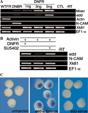 (A) Truncated FGF receptor induces endoderm markers in animal cap explants. RT-PCR analysis of animal caps dissected at stage 8.5 and cultured until stages 11 and 24 to measure fate markers. EF1-α was used to normalize cDNA samples. The RT(â) lane contains all reagents except reverse transcriptase and is used as negative control. (A) Mixer, an early endodermal marker, and edd (endodermin), a late pan-endoderm marker, were induced by DNFR RNA in a dose-dependent manner. Actin, a mesoderm marker, was not induced. N-CAM, a late neural marker, was detected in dominant-negative BMP-4 receptor (DNBR)-injected animal cap. DNFR RNA (1â5 ng/embryo), wild-type FGF receptor (WTFR) (1 ng/embryo) RNA, and DNBR RNA (1 ng/embryo) were injected radially into each blastomere at two-cell stage. (B) Animal caps treated with SU5402, a chemical inhibitor of FGFR1a, also displayed endoderm marker induction in a dose-dependent fashion. (B) Induction of endoderm by DNFR expression or SU5402 treatment in activin-treated or DNBR RNA-injected animal caps. FGF signal inhibition (DNFR or SU5402) can enhance edd gene expression in the activin or DNBR-treated animal cap explants. DNFR or DNBR RNA-injected animal caps were dissected from embryos injected with 3 ng DNFR RNA or 1 ng DNBR RNA, respectively. Activin was added to a final concentration of 0.15 ng/ml (general mesoderm marker genes were induced at this concentration) and SU5402 was added to a final concentration of 10 μM. Animal caps were cultured until stage 24. (C) In situ hybridization using an edd probe. Left, uninjected explants hybridized with antisense edd probe. Center, an embryo injected with DNFR RNA. Strong expression of edd was detected when compared with sense probe treated explants (right). The explants in the center and right panels were derived from embryos injected with 3 ng DNFR RNA.