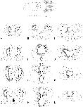 Fig. 5. (AâL) Schematic coronal illustration of neurogenic zones (gray bands surrounding ventricles on left of sections; identified by the distribution of BrDU and pH3 immunoreactivity) and thyroid hormone receptor β (TRβ) immunoreactivity (-ir; large and small dots on right of sections) distribution in the brain of NF stage 52 X. laevis tadpoles following 48 h treatment with T3 (50 nM). TRα mRNA, which is not shown in the figure, is highly expressed in all neurogenic zones and many other areas throughout the tadpolebrain. The drawing at the top of the figure shows a dorsal view of the X. laevis brain. Letters correspond to the rostrocaudal location of sections as depicted in the whole-brain drawing. Large circles represent large cells that exhibited robust TRβ-ir, and small circles represent smaller TRβ-ir cells. The anatomical drawings are from Tuinhof et al. (1998), with modifications of basal ganglia subdivisions according to (MarÃn et al., 1998). Abbreviations are defined in Table 2.