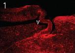 Fig. 6. (A) Western blots testing the specificity of antisera raised against synthetic peptides corresponding to xTRα (top gel; 1:1000) and xTRβ (bottom gel; 1:1000). Polyacrylamide gels (10 %) were loaded with lysates of bacteria expressing xTRα (lanes 1,2,3: 5, 2.5, 1.25 μl induced lysate; lane 4, 5 μl uninduced lysate) or xTRβ (lanes 5,6,7: 5, 2.5, 1.25 μl induced lysate; lane 8, 5 μl uninduced lysate). Note that the anti-xTRα serum crossreacts with xTRβ (arrows showing two immunoreactive bands in both lysates) and was not used for further study; whereas, the anti-xTRβ serum was specific for xTRβ and was used for IHC. (B) Representative photomicrographs of transverse sections through the brain of a NF stage 52 tadpole that had been treated with T3 (50 nM) for 48 h showing the distribution of TRβ immunoreactive (TRβ-ir) cells. 1. Dorsal pallium (dp), medialpallium (mp) and lateralpallium (lp), and internal granule cell layer (igl; Fig. 5, panel B). 2. Dorsal, medial and lateralpallium, striatum (Str) and accumbens (Acc; Fig. 5, panel C). 3. Dorsal, medial and lateralpallium, lateralamygdala (LA), medialamygdala (MeA) and central amygdala (CeA; Fig. 5, panel D). 4. Anterior preoptic area (Fig. 5, panel D). 5. Ventral hypothalamic area (Fig. 5, panel G). 6. Optic tectum (Fig. 5, panel J). Scale bar = 200 μm.