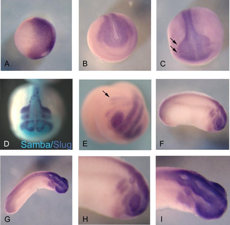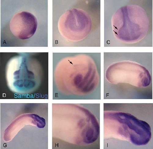Figure 3. Samba is expressed in the neural and neural crest derivatives as seen by in situ hybridization. A: Vegetal view of stage 10 embryos with dorsal side to the right. Samba expression is concentrated in the dorsal region. B: Neurula stage embryo. Samba is present in the neural plate and crest domain. C: Anterior-dorsal view of late neurula stage embryo. Arrows point to the outer edge of the forming migratory crest domain, which expresses Samba. D: Double in situ for Slug and Samba show that Samba overlaps with Slug-expressing migrating streams but is not restricted to neural crest domain. Slug probe was developed with a violet stain and Samba with blue stain. E: Anterior-lateral view of tail bud stage embryo indicates that Samba is expressed in migrating lateral streams of crest cells (arrow) and optic vesicles. F: Lateral view of tail bud stage embryo showing that Samba remains in the crest cells, optic vesicle, and now appears in the otic vesicle as well. G: Dorsal view of a late tail bud stage embryo. H,I: Higher magnification of cranial expression in Figures F and G.