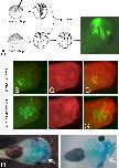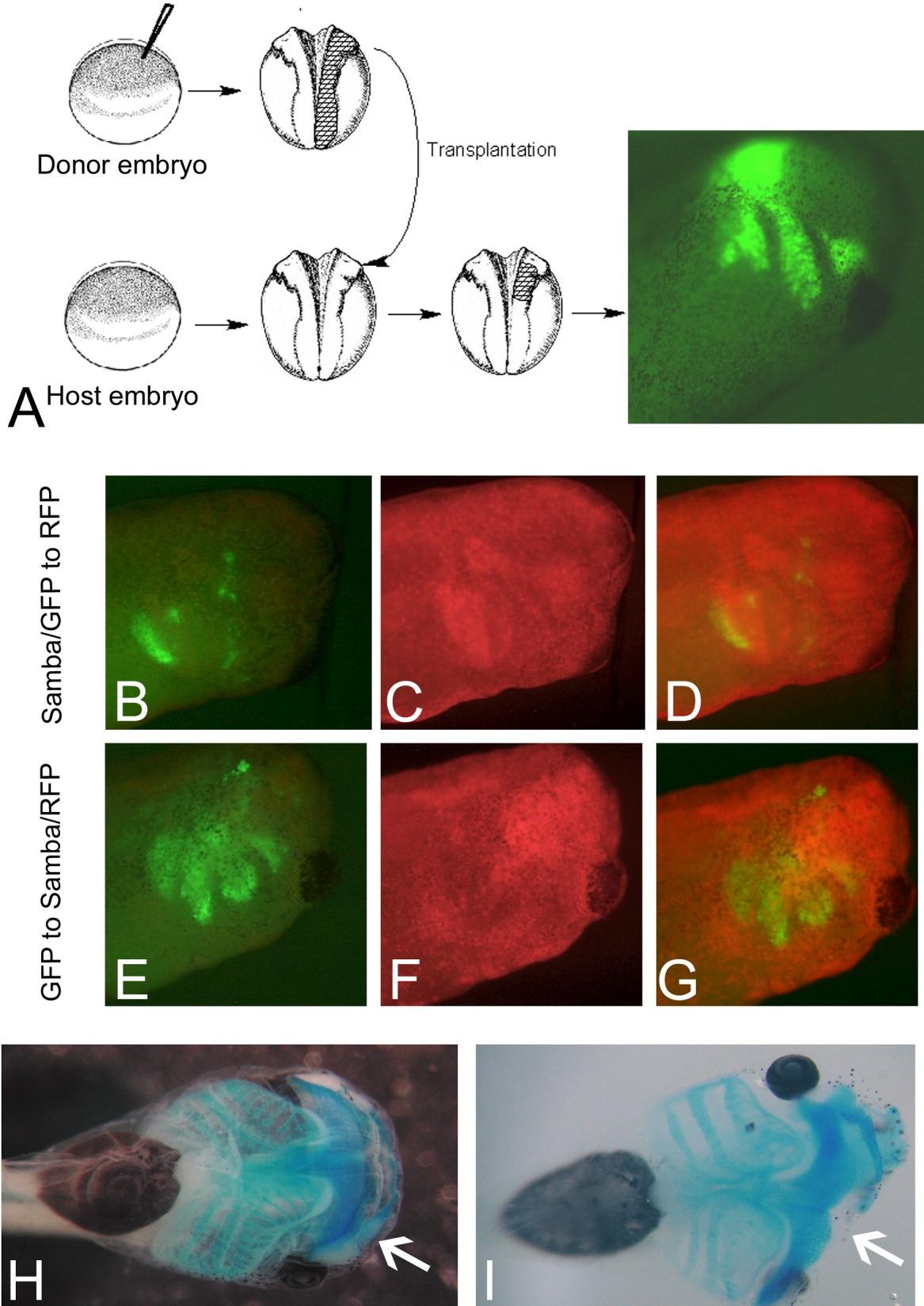 Figure 5. Samba inhibits migration of crest cells and formation of crest derivatives. A: Diagram of the cranial neural crest transplantation procedure and the resulting embryo. Green fluorescent protein (GFP) -positive crest cells migrating from the transplant generated the characteristic streams of migration in control embryos injected with 500 pg of GFP (for details see the Experimental Procedures section). B-D: Crest cell migration was limited in red fluorescent protein (RFP) embryos that received transplants from donors co-injected with 200 pg of Samba and GFP. Green channel showing GFP-positive transplanted cells (B); red channel showing RFP-positive host cells (C) and overlay of green and red channels (D). E-G: In contrast, when the transplants expressed only GFP and were inserted into RFP-Samba-overexpressing embryos, crest cell migration was normal. Green channel showing GFP (E); red channel showing RFP (F) and overlay of green and red channels (G). H: Ventral view of an Alcian-blue-stained embryo injected with GFP on the left animal pole. Arrow points to the left maxillary cartilage. F: Embryo injected with 200 pg of Samba lacks the left maxillary cartilage (arrow).