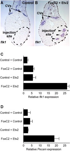 Figure 3. Misexpression of FoxC2 and Etv2 in Xenopus Embryos Induces Ectopic Endothelial Gene ExpressionXenopus embryos were injected with mRNAs encoding FoxC2 and Etv2 or EGFP control mRNA at the 4-cell stage and then collected at stage 36. After collection, embryos were either assayed by in situ hybridization using flk1 probe, followed by sectioning (A and B), or RNA was extracted for qPCR analysis of flk1 (C) or Pecam (D) transcripts. (A and B) flk1 expression was observed in the cardinal veins (CVs) in control (A) and FoxC2 + Etv2-injected (B) embryos. In addition, ectopic expression of flk1 was readily observed in the endoderm of the caudal region of FoxC2 + Etv2-injected embryos (B) but not in EGFP control injected embryos (A).(C and D) Quantitative, real-time PCR shows that neither FoxC2 nor Etv2 significantly activated flk1 or Pecam expression on their own, but the combination of the two factors strongly induced expression of both endothelial-specific markers. Data are shown as the mean relative expression of flk1 or Pecam transcripts for three independent sets of injections and analyses. Error bars indicate the SEM.