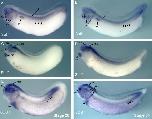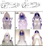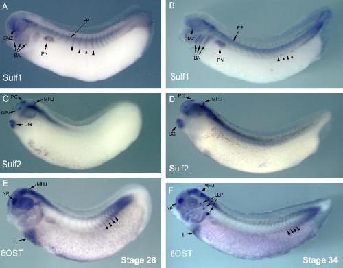 Fig. 1. Expression of Sulf1, Sulf2 and 6OST during tailbud stages in Xenopus laevis. (A) Lateral view of a stage 28 embryo hybridised to a probe for Sulf1A (BG408276). (B) Lateral view of a stage 34 embryo hybridised to a probe for Sulf1A. (C) Lateral view of a stage 28 embryo hybridised to a probe for Sulf2 (BG814048). (D) Lateral view of a stage 34 embryo hybridised to a probe for Sulf2. (E) Lateral view of a stage 28 embryo hybridised to a probe for 6OST (XL037105). (F) Lateral view of a stage 34 embryo hybridised to a probe for 6OST. Abbreviations: BA, branchial arches; CG, cement gland; CMZ, ciliary marginal zone; FP, floorplate; L, liver; LLP, lateral line placodes; MHJ, midbrainâhindbrain junction; NP, nasal placode; PN, pronephros; arrowheads denote some of the somites repeated along the embryonic axis.
