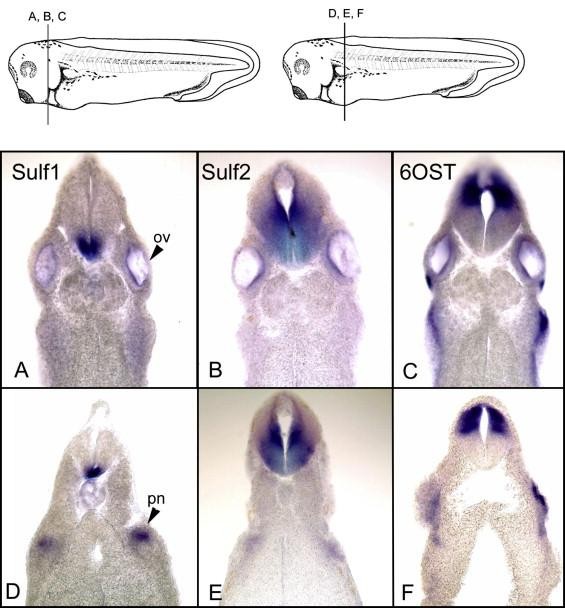 Fig. 2. Cross-sections of tailbud (stage 34) Xenopus laevis embryos hybridised to probes for Sulf1 (A and D), Sulf2 (B and E), and 6OST (C and F). Panels AâC are sections taken at the level of the otic vesicle. Panels DâF are sections taken at the level of the pronephros. Diagram shows level of sections taken. ov, otic vesicle; pn, pronephros.