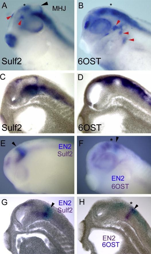 Fig. 3. Complementary expression of Sulf2 and 6OST in the brain of Xenopus laevis embryos at stage 28. (A) Sulf2 is expressed in the ventralmidbrain and hindbrain, the cement gland, the nasal placodes (red arrowheads), the retina, the midbrainâhindbrain junction, and the pineal gland (red asterisk). (B) 6OST is expressed in the dorsal part of the midbrain and hindbrain, but a reduced level of 6OST expression is found at the midbrainâhindbrain junction (MHJ). 6OST expression is also detected in the olfactory placodes, and in the three lateral line placodes posterior to the eye (red arrowheads). (C) A parasagital-section through the brain shows the ventral expression of Sulf2 in the midbrain and hindbrain. (D) A parasagital-section through the brain shows the tight restriction of 6OST expression to the dorsal part of the midbrain and hindbrain. (E) Double in situ hybridisation to En2 (blue) and Sulf2 (purple). Expression in the midbrainâhindbrain junction is indicated with an arrowhead. (F) Double in situ hybridisation to En2 (blue) and 6OST (purple). The midbrainâhindbrain junction is indicated with an arrowhead, and the gap in 6OST expression is indicated with an asterisk. (G) A section through the head of an embryo showing the expression of Sulf2 (purple) and En2 (blue) in the midbrainâhindbrain junction as indicated with an arrowhead. (H) A section through the head of an embryo showing the expression of En2 (purple) and 6OST (blue). The midbrainâhindbrain junction is indicated with an arrowhead, and the gap in 6OST expression is indicated with an asterisk.