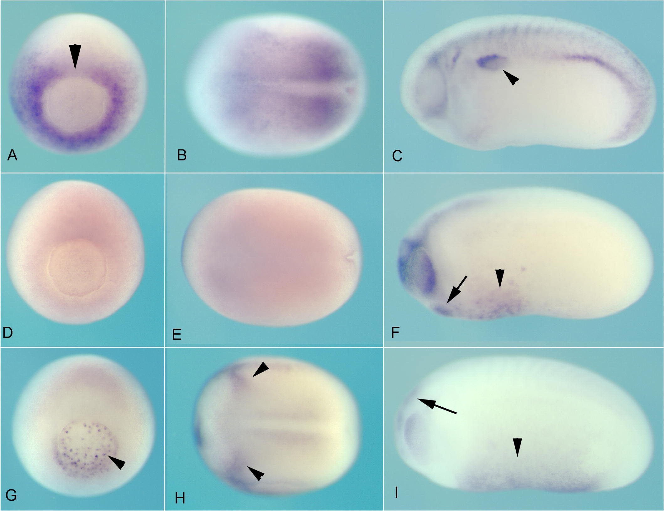 Supplementry Fig. 2. (A) Vegetal view of a stage 11.5 embryo. The zygotic expression of Xenopus laevis Sulf1 is first detected in the mesoderm during mid-gastrula stage, but is excluded from the most dorsal mesoderm (arrowhead). (B) Dorsal view of a stage 14 embryo. Sulf1 is expressed in the paraxial mesoderm, but is excluded from the dorsal midline. (C) Lateral view of a stage 23 embryo. Sulf1 is expressed in the pronephros (arrowhead), somites and posteriormesoderm as well as anterior neural tissue. (D) Vegetal view of a stage 11.5 embryo hybridised to Xenopus laevis Sulf2. Zygotic Sulf2 expression is not detected. (E) Dorsal view of a stage 14 embryo. Zygotic Sulf2 expression is not detected. (F) Lateral view of a stage 23 embryo. Sulf2 expression is detected in a ventral region that could include haemangioblasts (arrowhead), in the mesendoderm underlying the cement gland (arrow), and in anterior neural tissue. (G) Vegetal view of a stage 11.5 embryo. The zygotic expression of Xenopus laevis6-O-sulfotransferase is only detected in endoderm as the punctuate staining indicated by the arrowhead. (H) Dorsal view of a stage 14 embryo. 6OST is expressed in the two bars in the presumptive hindbrain (arrowheads) and in the paraxial mesoderm. (I) Lateral view of a stage 23 embryo. 6OST is expressed in the endoderm (arrowhead) and in anterior neural tissues (arrow).
