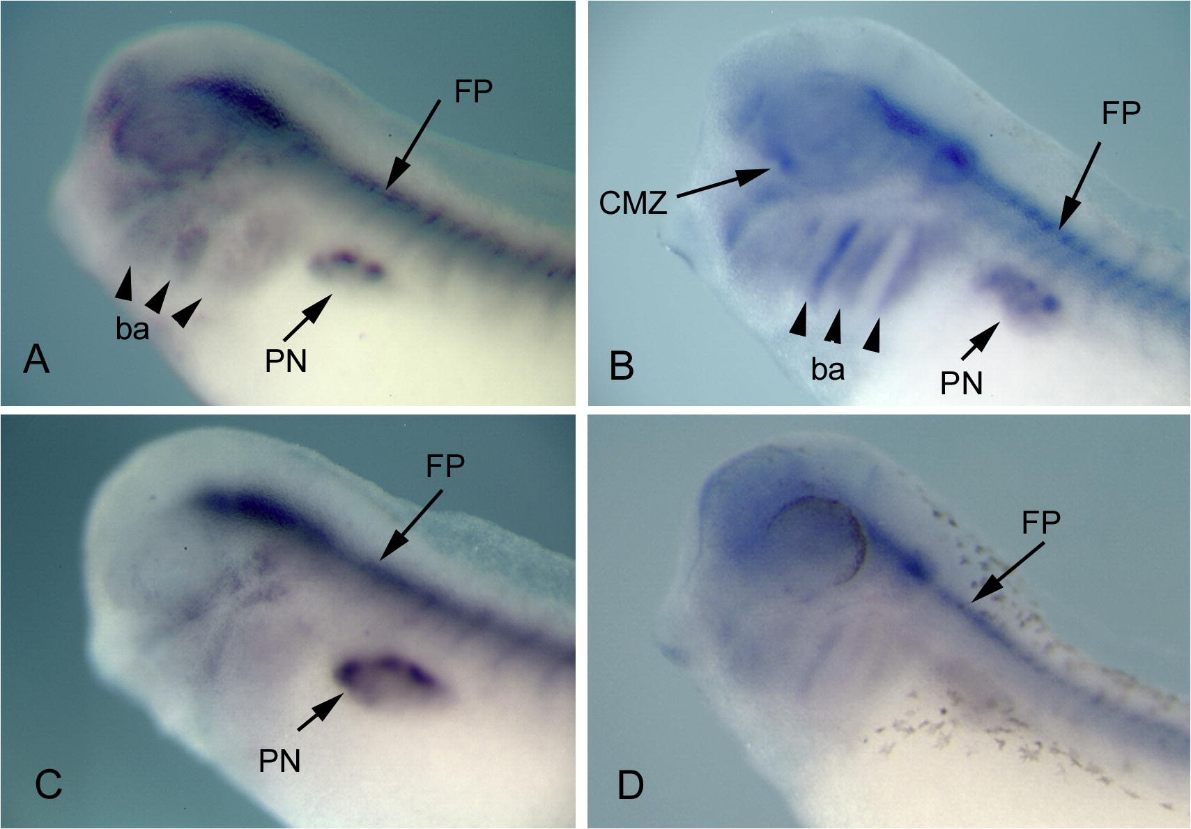Supplementry Fig. 3. Expression of the two alleles coding for Xenopus laevis Sulf1. (A) Shows the expression of Sulf1A (BG408276) in the head of a Stage 28 embryo. (B) Shows the expression of Sulf1A in the head of a Stage 34 embryo. (C) Shows the expression of Sulf1 B (BQ733206) in the head of a Stage 28 embryo. (D) Shows the expression of Sulf1B in the head of a Stage 34 embryo. Abbreviations: BA, branchial arches; CMZ, ciliary marginal zone; FP, floorplate; PN, pronephros.