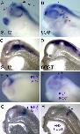 Fig. 4. Sulf1 is expressed in the ventricular zone of the forebrain and midbrain and the floorplate of the neural tube. (A) A cross-section taken at an oblique angle through a stage 28 Xenopus laevis embryo hybridised to Sulf1 showing Sulf1 expression in the ventricular zone in the forebrain. (B) Cross-section through the midbrain showing Sulf1 expression in the ventricular zone. Arrowhead indicates expression in CMZ. (C) Cross-section through the hindbrain showing ventral expression of Sulf1. (D) Sagital-section through the brain showing the ventral expression of Sulf1. (E) Sagital-section through the neural tube showing the expression of Sulf1 in the floorplate and ventralhindbrain. Arrow indicates midbrainâ hindbrain junction.