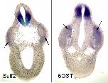 Supplementry Fig. 4. Sections taken through the eyes of stage 28 embryos subsequent to in situ hybridisation for Sulf2 and 6OST reveal the expression of Sulf2 and 6OST in the retina as indicated by arrows.