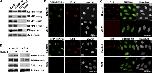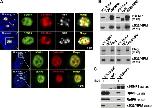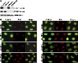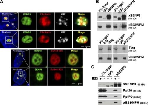 Figure 1. SENP3 and SENP5 colocalize and associate with B23/nucleophosmin. (A) U2OS-derived cell lines expressing GFP-SENP3 and GFP-SENP5 were transfected with a plasmid for expression of dsRed-fibrillarin (top). After 48 h, the cells were fixed and immunostained with monoclonal anti-UBF antibodies. The left column shows GFP, dsRed, and anti-UBF in the context of the nucleus, with DNA stained in blue using Hoechst 33342. The same cells were transfected with dsRed-B23/nucleophosmin (bottom). (B) Rabbit IgG (IgG), anti-xSENP3, or anti-xB23/nucleophosmin (xB23/NPM) antibodies were used for immunoprecipitation from 100 μl of interphase XEE (top). The samples were subjected to SDS-PAGE and immunoblotting with anti-xSENP3 or anti-B23/nucleophosmin antibodies. To test xSENP5 binding to xB23/nucleophosmin, 25 μl of XEE containing in vitro–translated FLAG-tagged xSENP5 was mixed with equal volume of interphase XEE. Immunoprecipitations were performed with anti-FLAG or anti-xB23/NPM antibodies (bottom). The samples were subjected to immunoblotting with anti-FLAG or anti-xB23/NPM antibodies. (C) Anti-xSENP3 was used for immunoprecipitation from IgG-treated control (+) or xB23/NPM-depleted (−) XEEs. The samples were subjected to SDS-PAGE and Western blotting with anti-xSENP3, -Rpl26, -RplP0, or -xB23/NPM antibodies, as indicated on the right.