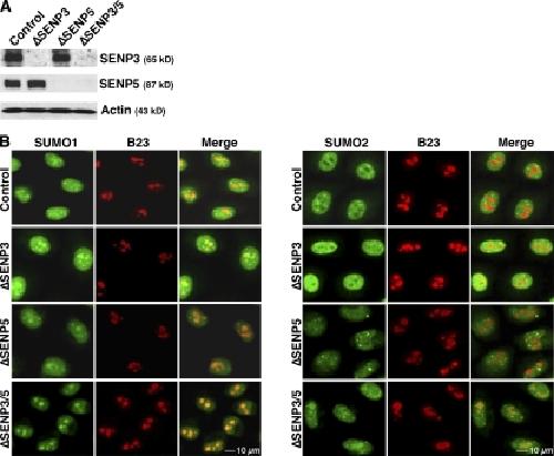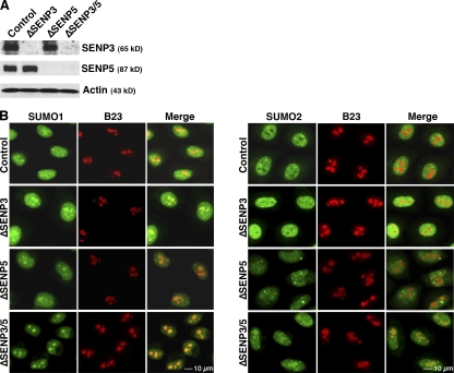 Figure 2. SENP3 and SENP5 codepletion cause nucleolar SUMO protein accumulation. (A) HeLa cells were transfected with siRNAs directed against SENP3 and SENP5, either singly or in combination. 72 h after transfection, depletion was confirmed by Western blotting. (B) Cells depleted of SENP3, SENP5, or both proteins were stained with antibodies against B23/nucleophosmin (B23; red) and either SUMO-1 (left; green) or SUMO-2/3 (right; green).