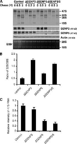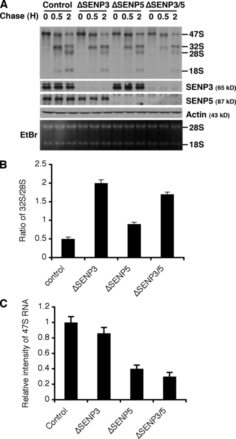 Figure 3. Depletion of SENP3 or SENP5 cause defects in ribosome biogenesis. (A) HeLa cells were transfected with control oligonucleotides (Control) or siRNAs directed against SENP3 (ΔSENP3) and SENP5 (ΔSENP5) or both SENP3 and SENP5 (ΔSENP3/5). 72 h later, the cells were pulsed with [3H]uridine for 25 min, followed by washing and incubation with fresh media supplemented with 1 mg/ml of cold uridine for the indicated times (in hours). At each time point, equal numbers of cells were harvested for analysis of rRNA synthesis and processing. (Bottom) Western blots of cell extracts to monitor SENP3 and SENP5 and Western blotting of actin as a loading control. Ethidium bromide staining shows the amount of total RNA loaded in each lane. (B) The amounts of 28S and 32S RNAs were quantitated within three independent experiments as in A after 2 h. Ratios of 32S to 28S RNAs were calculated for each experiment. Bars represent the mean values calculated from the three experiments ± SD. (C) The amount of 47S pre-rRNA transcript was quantitated at the initiation of the chase period (0 h) within three independent experiments as in A and normalized to the levels found in cells treated with control oligonucleotides. Bars represent the mean of normalized values from the three experiments ± SD.