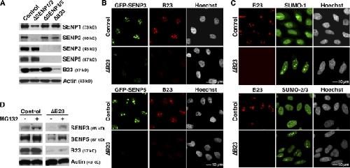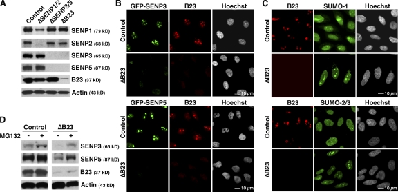 Figure 4. B23/nucleophosmin regulates SENP3 and SENP5 abundance. (A) HeLa cells were transfected with control oligonucleotides (left lane), siRNAs for codepletion of SENP1 and SENP2 (second lane), siRNAs for codepletion of SENP3 and SENP5 (third lane), or siRNAs for depletion of B23/nucleophosmin (right lane). After 72 h, the cells were harvested and immunoblotted with the indicated antibodies, where actin serves as a loading control. (B) U2OS cells stably expressing either GFP-SENP3 (top) or GFP-SENP5 (bottom) were transfected with control or B23/nucleophosmin siRNA, as indicated. After 72 h, the cells were washed and fixed with 4% paraformaldehyde and stained with antibodies against B23/nucleophosmin (red). Signals from the GFP-SENP3 and GFP-SENP5 fusion proteins are shown in green. (C) As in A, HeLa cells were transfected with control oligonucleotides or with siRNAs for depletion of B23/nucleophosmin. After 72 h, the cells were stained with antibodies against B23/nucleophosmin (red) and against either SUMO-1 or SUMO-2/3 (green), as indicated. (D) 48 h after transfection with control or B23/nucleophosmin siRNAs, HeLa cells were treated for 6 h with 20 μM of proteasome inhibitor MG132 (+) or DMSO (−). The cells were harvested and subjected to Western blotting analysis with antibodies against SENP3, SENP5, B23/nucleophosmin, and actin, as indicated.