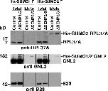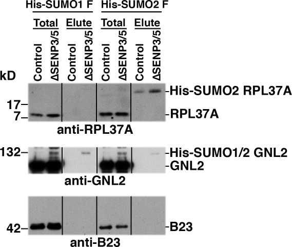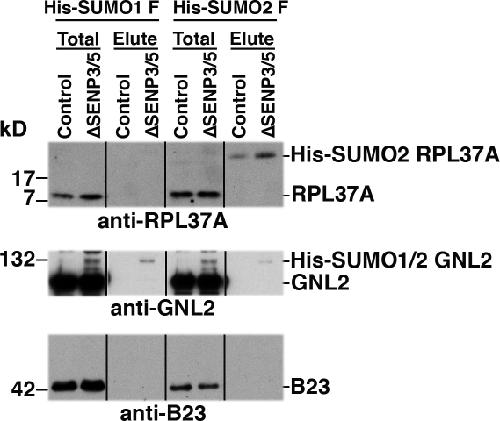 Figure 5. Enhanced SUMO modification of RPL37A and GNL2 after depletion of SENP3 and SENP5. U2OS stably expressing full-length His-tagged versions of SUMO-1 and SUMO-2 (His-SUMO1F and His-SUMO2F) were transfected with siRNAs for codepletion of SENP3 and SENP5 or with control oligonucleotides. After 72 h, the cells were harvested and His6-SUMO–modified proteins were isolated. Total cell extracts and His6 affinity fractions were analyzed by Western blotting with antibodies against RPL37A (top), GNL2 (middle), or B23/nucleophosmin (bottom).