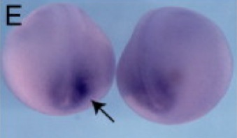irf6 (interferon regulatory factor 6) gene expression in Xenopus laevis embryos, assayed via in situ hybridization, NF stage 18, posterior view, dorsal up.