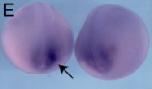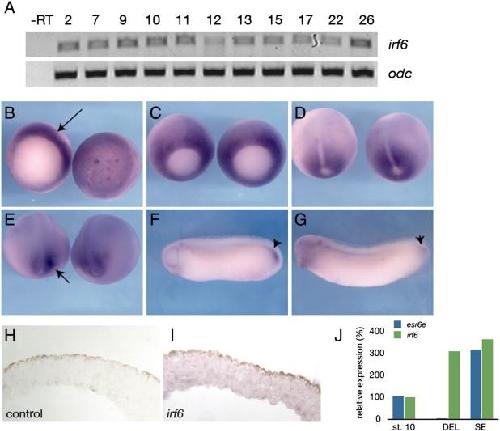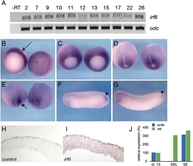 Fig. 5. Expression of irf6 in Xenopus laevis. (A) RT-PCR analysis of irf6 expression at different stages of development. Developmental stages are indicated at the top (Nieuwkoop and Faber, 1956). â RT, negative control reaction without reverse transcriptase. (BâG) Whole mount in situ hybridization for irf6. (B) Stage 10.5, left is vegetal view, arrow indicates expression in the dorsal marginal zone. Right is animal pole view. (C) Stage 11, expression is throughout marginal zone, but beginning to be lost from dorsal midline. (D) Stage 12.5, expression around blastopore, absent from prospective notochord. (E) Stage 18, expression flanking prospective tailbud region, arrow. (F) Stage 28 and (G) stage 30, notable expression in tailbud, arrowheads. (H) Section of animal cap hybridized with an irrelevant control probe (xnr3). (I) Section of animal cap hybridized with an antisense irf6 probe. Diffuse expression is found in both superficial and deep layers. (J) Quantitative RT-PCR of irf6 (green) and esr6e (blue) expression in ectodermal explants; st. 10 (stage 10 whole embryo), DEL (deep layer explant), SE (superficial layer explant).