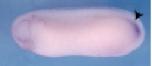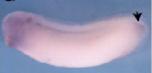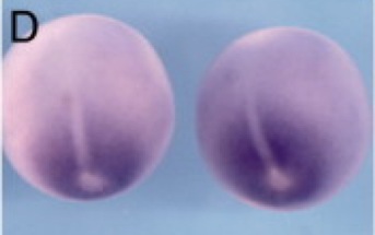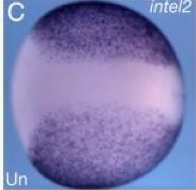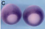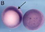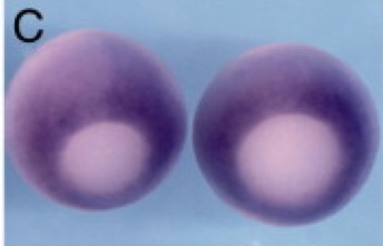 irf6 (interferon regulatory factor 6) gene expression in Xenopus laevis embryos, assayed via in situ hybridization, NF stage 10.5, vegetal/blastoporal view, dorsal up (left) and animal pole view ( right).
