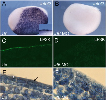 Fig. 8. Maternal Irf6 is required for SE differentiation in X. laevis. (A, B) Whole mount in situ hybridization of stage 14, control (A) uninjected (Un) and (B) Irf6-depleted (irf6 MO) embryos for intelectin 2 (intel2). Lateral view is shown, anterior is to the left. Inset shows close up views of the epidermis in a bisected embryo. (C, D) Sections of (C) uninjected and (D) Irf6-depleted stage 13 embryos stained with mAb LP3K. (E, F) Sections of, (E) control and, (F) Irf6-depleted stage 22 embryos stained with Azan. Dotted lines indicate the thickness of the ectoderm; arrows indicate the location of embryonic pigment.