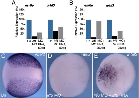 Fig. 9. Specificity of Irf6 depletion in Xenopus. (A) Quantitative RT-PCR of esr6e and grhl3 expression in controls (Un), Irf6-depleted embryos (irf6 MO) and depleted embryos injected with 50Â pg irf6.2 mRNA (MO + RNA), or (B) with 250Â pg irf6.2 mRNA (MO + RNA). (Câ E) Whole mount in situ hybridization for intelectin 2 at stage 14, (C) control uninjected (Un), (D) Irf6-depleted (irf6 MO) and (E) rescued embryos (irf6 MO + irf6 RNA).