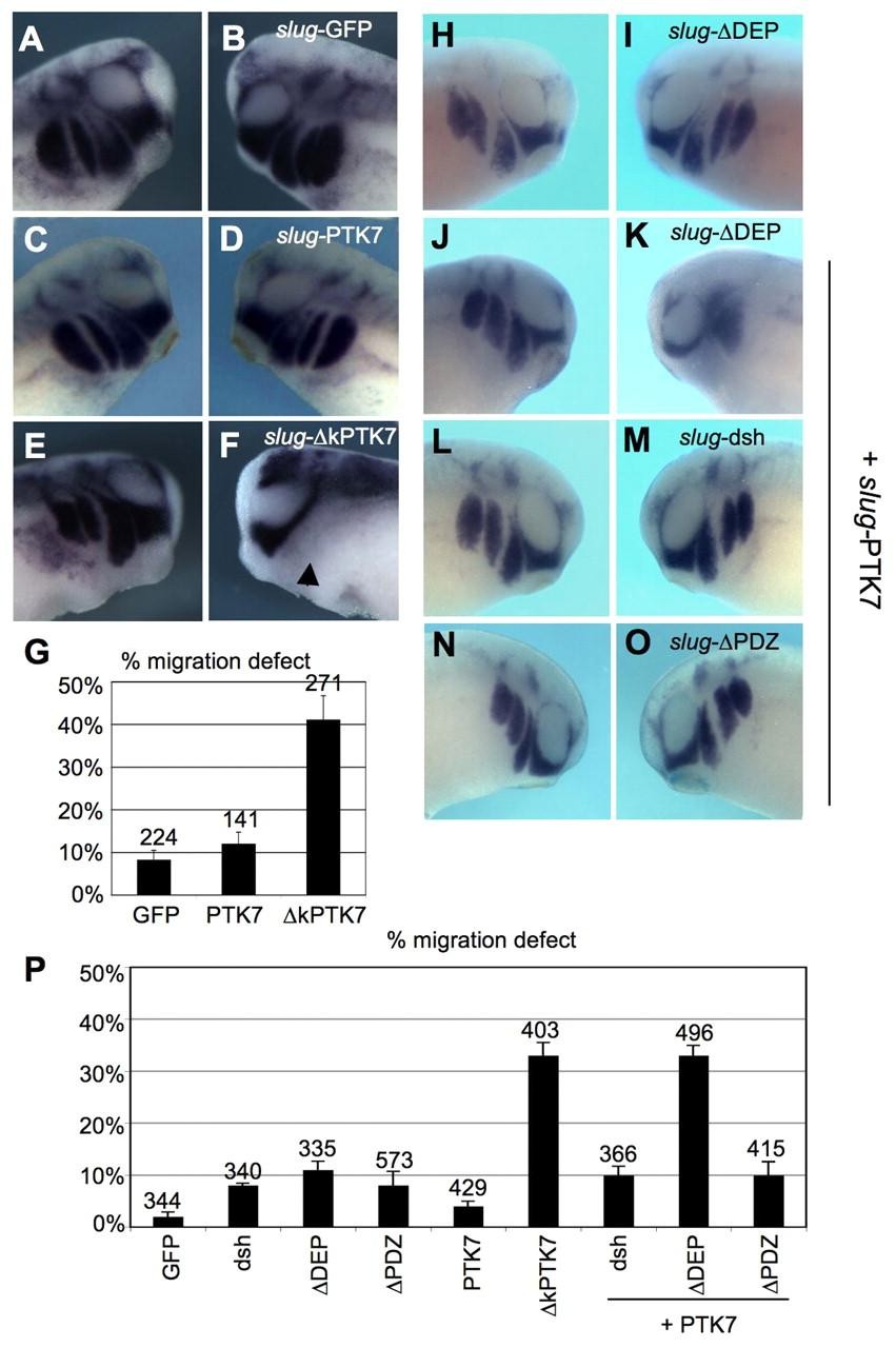 Fig. 7. Neural-crest-specific expression of PTK7 and dsh constructs. Two-cell stage embryos were injected in one blastomere with plasmids containing a minimal slug promoter driving either the expression of GFP (A,B), wild-type PTK7 (C,D) or δkPTK7 (E,F). (A-F) Tadpole stage embryos analyzed by twist in situ hybridization. The injected side is presented in the right panel (B,D,F). (A,B) Embryo injected with 100 pg slug-GFP plasmid. (C,D) Embryo injected with 100 pg slug-PTK7 plasmid. (E,F) Embryo injected with 100 pg slug-δkPTK7. Arrowhead in F indicates the inhibition of neural crest migration. (G) Graph summarizing the percentage of migrating neural crest cells in five independent injection experiments. The number of injected embryos is indicated on each column. (H,I) Embryo injected with 50 pg slug-δDEP. (J-O) Embryo injected with 50 pg slug-PTK7 together with 50 pg slug-δDEP (J,K) or 50 pg slug-dsh (L,M) or 50 pg slug-δPDZ (N,O). (P) Graph summarizing three dsh and PTK7 co-injection experiments. The number of injected embryos is indicated on each column.