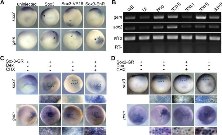 Fig. 2. Sox3 activates geminin and sox2 expression in the absence of protein synthesis. (A) WISH of stage 12 embryos injected with sox3, sox3-VP16, or sox3-EnR mRNA (200â800 pg) at the 1-cell stage. Sox3 and Sox3-VP16 expand expression of sox2 and gem (arrows) and Sox3-EnR induces gem in stage 12 embryos. Images are ventral view with the anterior to the top. (B) High levels of Sox2 and Sox3 induce expression of gem in ectodermal explants. RT-PCR analysis of ectodermal explants for sox2, gem and ef1α expression from embryos injected with noggin (25 pg), sox2, sox3 (500 or 800 pg) and sox3-VP16 (200 pg). Sibling embryos were stage 12. (C) Sox3-GR induces expression of sox2 (Dex, n = 22/30; Dex + CHX, n = 12/20) and gem (Dex, n = 31/35; Dex + CHX, n = 46/54). (D) Sox2-GR induces gem in the absence of protein synthesis (Dex, n = 25/43; Dex + CHX, n = 35/47). WISH of embryos injected with either Sox2-GR or Sox3-GR (400 pg) and incubated without or with Dex (1 μM), CHX (10 μM), or Dex + CHX at either stage 9.5 or 11 and collected at stage 12. Hatched rectangle indicates region of flat mount high magnification shown below whole embryo images.