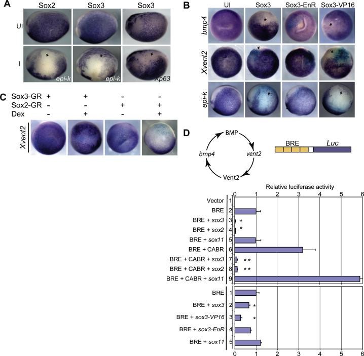 Fig. 4. Sox3, Sox2 and Sox3-VP16 inhibit Xvent2 expression and epidermal formation. (A) WISH for epi-k and Xp63 in embryos injected with 400â800 pg of sox3 or sox2 mRNA with lacZ (100 pg) mRNA into one of 2-cells. Uninjected (UI) side in top row, injected (I) side in bottom with arrow indicating injected area. Anterior is to the left and dorsal to the top. (B) Sox3, sox3-EnR, or sox3-VP16 mRNA (200â400 pg) was injected with lacZ mRNA into one of 2 blastomeres and gastrula or neurula embryos were assayed for bmp4, Xvent2 or epi-k expression by WISH. Bmp4 and Xvent2 (st. 12) embryos are animal pole view with the dorsal side to the top and epi-k embryos (st. 17) are a lateral view with anterior to the left. (C) WISH of stage 12 embryos injected with Sox3-GR into one blastomere of 2-cell embryos and untreated or treated with Dex at stage 9.5. Embryos are an animal pole views with dorsal to the top. (D) Diagram of BMP positive feedback loop, BRE-luciferase construct and relative luciferase activities in bar graph form. One-cell embryos were injected in the animal pole with vector or BRE-luciferase with sox3, sox2, sox11, sox3-EnR (400 pg), or sox3-VP16 mRNA (200 pg) and 50 pg CABR mRNA (top: lanes 3â9, and bottom: 2â5). The graph represents one experiment done in triplicate. Horizontal lines represent standard deviations. *p < 0.05 indicates values that differ significantly from lane 2 and **p < 0.01 indicates values that differ significantly from lane 6, Studentâs t-test.