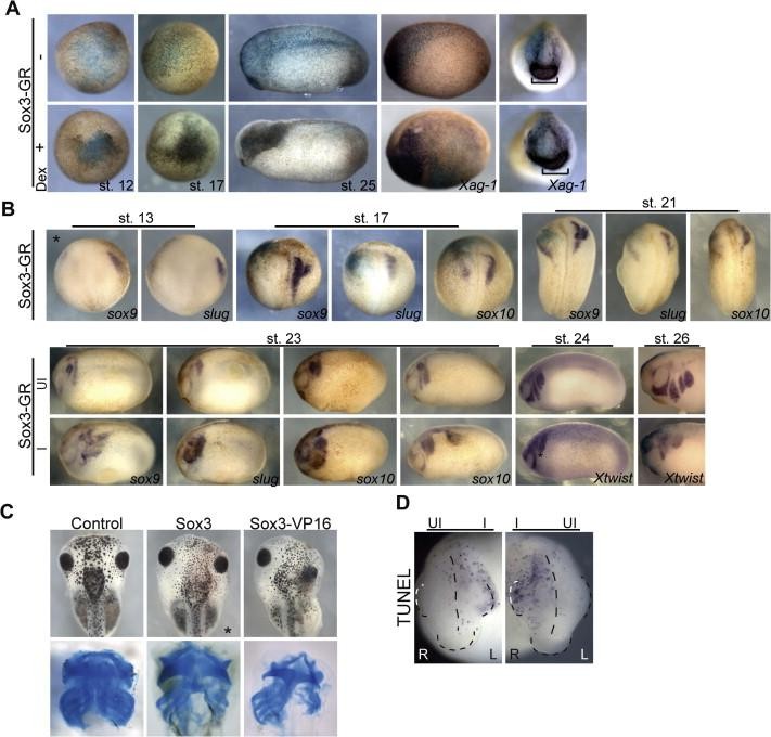 Fig. 6. Sox3 interferes with neural crest formation and migration. (A) Overexpression of sox3-GR induces ectopic pigment (129/181) and expands the cement gland but does not induce ectopic cement gland as indicated by WISH of Xag-1 (n = 49/77) in two right panels. (B) WISH of sox9 (n = 47/68), slug (n = 36/57), and sox10 (n = 46/56) in embryos injected with Sox3-GR and lacZ mRNA. Dorsal view of stages 13â21 embryos with anterior to the top (top row). Asterisk marks injected side. After stage 21, expression is expanded (bottom row) (sox9, n = 33/38, slug, n = 50/52, sox10, n = 50/50), but migration is inhibited (Xtwist, n = 96/130). Uninjected and injected sides of same embryo shown. (C) Development of branchial cartilage is disrupted by Sox3 and Sox3-VP16 as demonstrated by cartilage staining using Alcian blue. Embryos are dorsal view with anterior to the top and cartilage is ventral view with anterior to the top. (D) Two representative embryos demonstrating that Sox3 induces apoptosis in the head region as marked by TUNEL staining (n = 13/22). Leftembryo injected in the left side and rightembryo injected in the right side to account for potential asymmetric cell death. All embryos injected in 1 of 2 cells with sox3 (400 pg), sox3-VP16 (100 pg) or sox3-GR (400 pg) and lacZ (100â200 pg) or GFP (300 pg) mRNA.