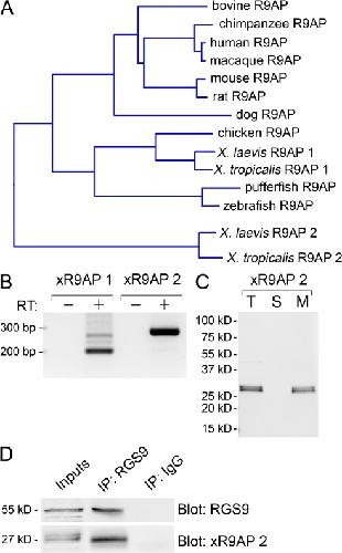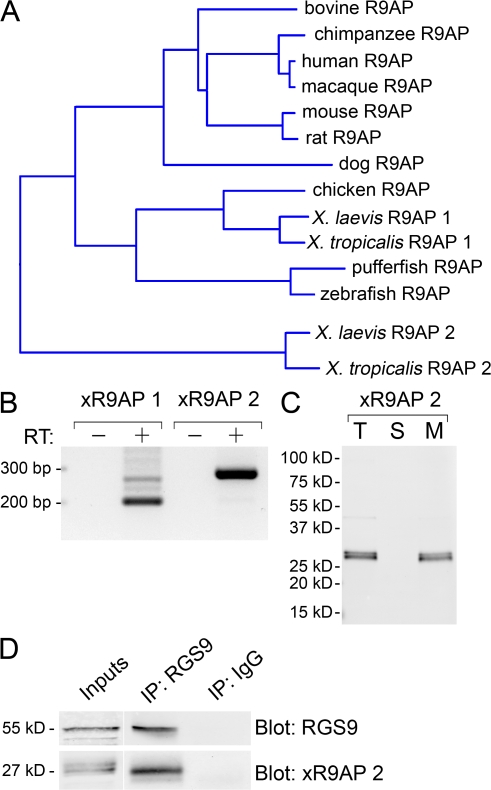 Figure 2. Identification of the photoreceptor-specific R9AP isoform in Xenopus. (A) Phylogeny tree of R9AP protein sequences built using the Neighbor-Joining method. Accession nos. are as follows: bovine, AAM67417; chicken, NP_989836; chimpanzee, XP_512566; dog, XP_855518; human, NP_997274; macaque, XP_001087093; mouse, NP_665839; pufferfish, CAF92756; rat, XP_001079782; zebrafish, XP_687644. Xenopus tropicalis R9AP1 is deduced from genome v4.1, scaffold 94 (920566:921276), and X. tropicalis R9AP2 is deduced from genome v4.1, scaffold 761 (402303:408685). (B) RT-PCR amplification of xR9AP1 and xR9AP2 transcripts from Xenopus retina; omission of reverse transcription (RT) in parallel samples served as a negative control for DNA contamination. (C) Western blot of Xenopus retina extract probed with the antibody specific to xR9AP2. Lane T, total extract; lane S; soluble protein fraction; lane M, membrane fraction. Note that the xR9AP2 band is a doublet, which reflects the previously documented phosphorylation of R9AP in photoreceptors (Martemyanov et al., 2003). (D) xR9AP2 coimmunoprecipitates with RGS9-1 from Xenopus retina. Beads coated with sheep IgG were used for the negative control.