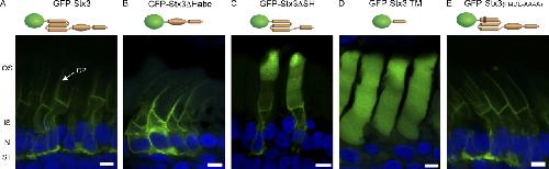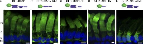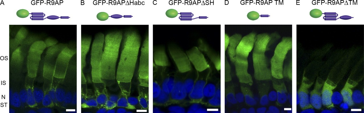 Figure 3. Localization of GFP-tagged R9AP and R9AP mutants in transgenic Xenopus rods. The following constructs were expressed in transgenic Xenopus rods: full-length GFP-tagged R9AP (A), GFP-tagged R9AP lacking the Habc domain (B), and GFP-tagged R9AP lacking the SNARE homology (SH) domain (C). (D) GFP-tagged transmembrane domain from R9AP. (E) GFP-tagged R9AP lacking the transmembrane domain. In all panels nuclei are counterstained with Hoechsts (blue). OS, outer segment; IS, inner segment; N, outer nuclear layer; ST, synaptic terminal. Bars, 5 μm.