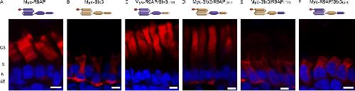 Figure 1. Localization of R9AP and syntaxin 3 in Xenopus photoreceptors. (A) Domain organization shared by R9AP and syntaxin 3. Both contain an N-terminal Habc domain, a SNARE homology domain, and a C-terminal transmembrane domain. (B) Immunofluorescence of R9AP (red) using the antibody against xR9AP2 in rod and cone outer segments of adult Xenopus retina. (C) Immunostaining of syntaxin 3 (green) in adult Xenopus retina. (B and C) The nuclei are counterstained with Hoechsts (blue). RPE, retinal pigmented epithelium; OS, outer segment; IS, inner segment; ONL, outer nuclear layer; OPL, outer plexiform layer; INL, inner nuclear layer; IPL, inner plexiform layer; GC, ganglion cell. No signals were revealed in controls where the primary antibodies were omitted. (D) Immunostaining of syntaxin 3 (green) in two examples of broken rod outer/inner segment preparations double labeled either with phalloidin (red; top), which labels the actin-rich calycal processes (CP), or with acetylated α-tubulin (red; bottom), which labels the axoneme within the connecting cilium and the outer segment. The right panels are the merged image with the shape of the entire cell fragment outlined in white, as seen in the transmitted light channel. Note that multiple calycal processes are seen as the image is a z-stack projection. (E) Cartoon of the rod photoreceptor with the regions containing R9AP in red and the regions containing syntaxin 3 outlined in green.