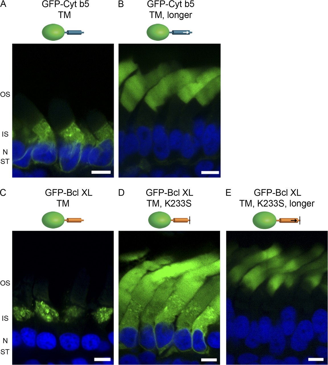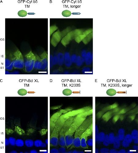 Figure 8. Localization of ER and mitochondrial-targeted GFP-tagged transmembrane domains and their length mutants in transgenic Xenopus rods. The following constructs were expressed as GFP fusion proteins in Xenopus rods (see Table S2 for sequence details, available at http://www.jcb.org/cgi/content/full/jcb.200806009/DC1): (A) transmembrane domain from microsomal cytochrome b5 (Cyt b5); (B) transmembrane domain from cytochrome b5 elongated by four amino acid residues; (C) transmembrane domain from Bcl XL; (D) transmembrane domain from Bcl XL bearing a point mutation (K233S); (E) transmembrane domain from Bcl XL bearing the K233S mutation and elongated by four amino acid residues. OS, outer segment; IS, inner segment; N, outer nuclear layer; ST, synaptic terminal. Bars, 5 μm.