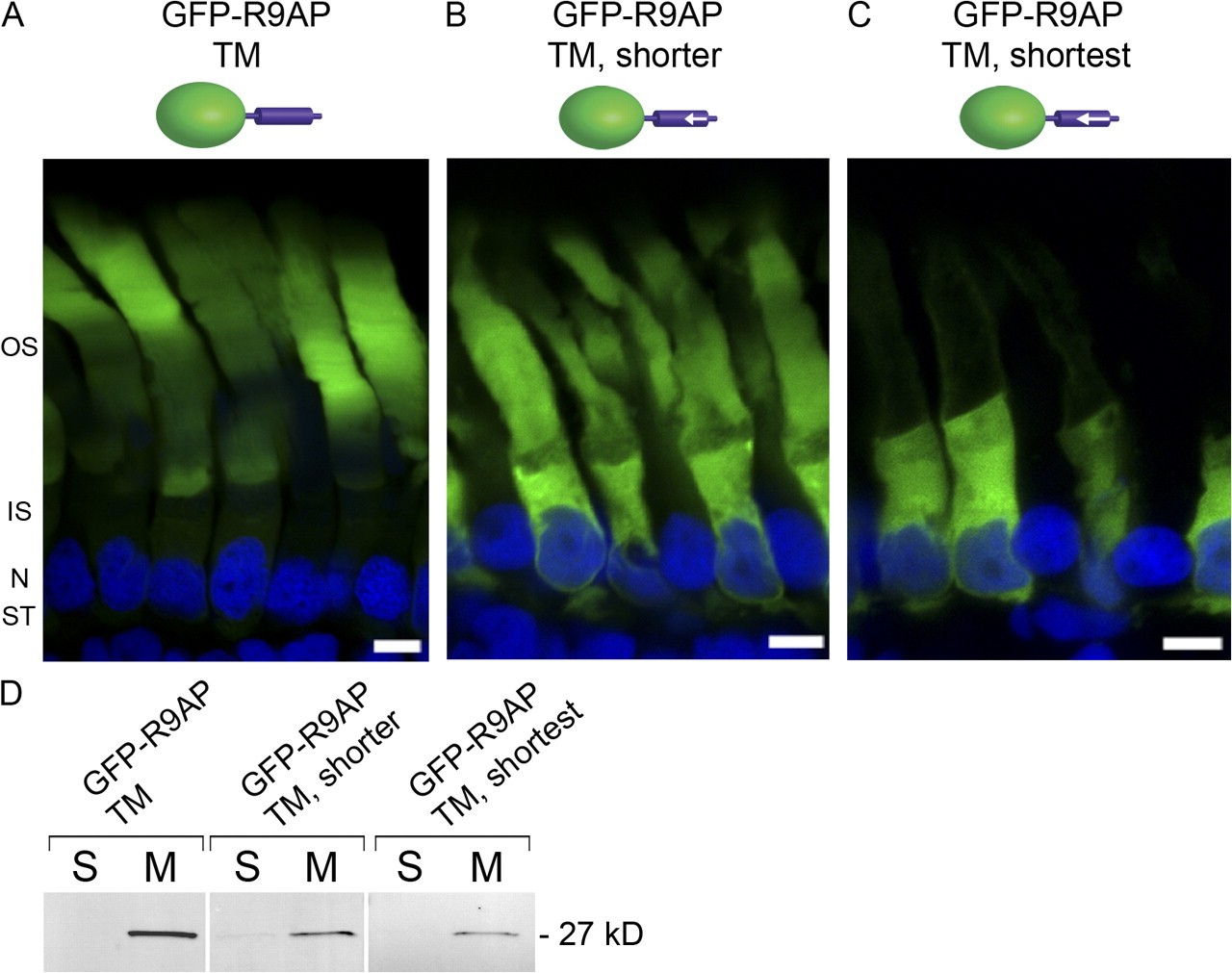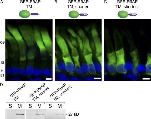 Figure 9. Localization of GFP-tagged R9AP transmembrane domain length mutants in transgenic Xenopus rods. (A) GFP-tagged transmembrane domain from R9AP. (B) GFP-tagged transmembrane domain from R9AP shortened by two amino acid residues. (C) GFP-tagged transmembrane domain from R9AP shortened by four amino acid residues. (D) Xenopus tadpole retinas expressing GFP-tagged R9AP transmembrane domains of various lengths as indicated were fractionated into soluble and membrane pools by sonication and sedimentation at 120,000 g. Proteins in each fraction were Western blotted using an antibody against GFP. Lane S, soluble protein fraction; lane M, membrane fraction. OS, outer segment; IS, inner segment; N, outer nuclear layer; ST, synaptic terminal. Bars, 5 μm.