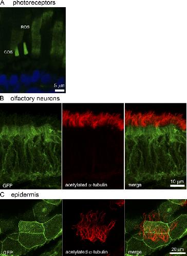 Figure 10. Patterns of transgenic GFP-R9AP or GFP-syntaxin 3 transmembrane domain expression in ciliated Xenopus tissues. (A) GFP-tagged full-length R9AP expressed in photoreceptors. (B) GFP-tagged transmembrane domain from syntaxin 3 expressed in olfactory cells and in the epidermis (C). (B and C) Cilia are labeled with an antibody against acetylated α-tubulin (red). COS, cone outer segment; ROS, rod outer segment.