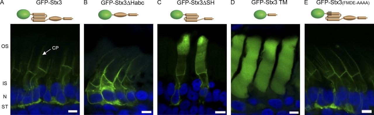 Figure 4. Localization of GFP-tagged syntaxin 3 and syntaxin 3 mutants in transgenic Xenopus rods. (A) Full-length GFP-tagged syntaxin 3 (Stx3). The arrow indicates the calycal processes (CP). (B) GFP-tagged syntaxin 3 lacking the Habc domain. (C) GFP-tagged syntaxin 3 lacking the SNARE homology domain. (D) GFP-tagged transmembrane domain from syntaxin 3. (E) Full-length GFP-tagged syntaxin 3 with the FMDE motif mutated to four alanines. OS, outer segment; IS, inner segment; N, outer nuclear layer; ST, synaptic terminal. Bars, 5 μm.