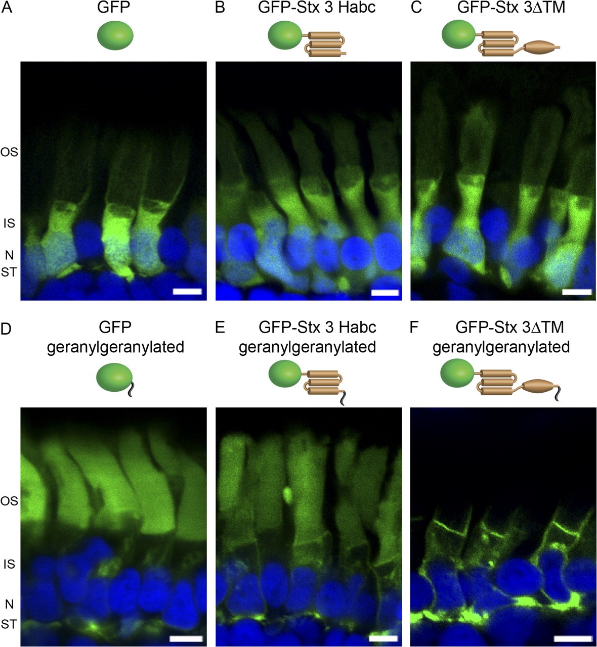Figure 5. Localization of soluble and geranylgeranylated GFP-tagged syntaxin 3 mutants in transgenic Xenopus rods. (A) Soluble GFP. (B) GFP-tagged syntaxin 3 lacking both the SNARE and transmembrane domains. (C) GFP-tagged syntaxin 3 lacking the transmembrane domain. (D) Geranylgeranylated GFP. (E) Geranylgeranylated GFP-tagged syntaxin 3 lacking the SNARE homology domain and transmembrane domain. (F) Geranylgeranylated GFP-tagged syntaxin 3 lacking the transmembrane domain. OS, outer segment; IS, inner segment; N, outer nuclear layer; ST, synaptic terminal. Bars, 5 μm.