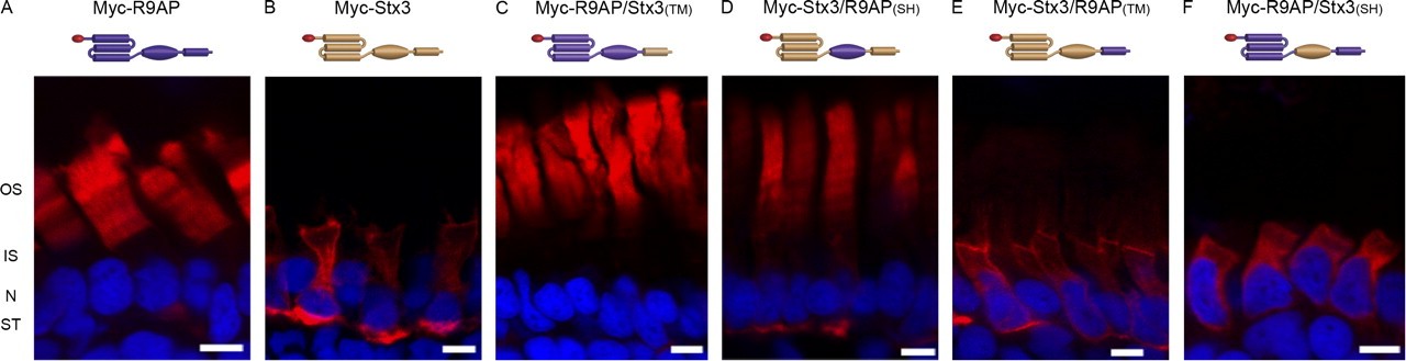 Figure 6. Localization of Myc-tagged R9AP/syntaxin 3 chimeras in transgenic Xenopus rods. (A) Full-length Myc-tagged R9AP. (B) Full-length Myc-tagged syntaxin 3 (Stx3). (C) Myc-tagged chimera of R9AP containing the transmembrane domain from Stx3. (D) Myc-tagged chimera of syntaxin 3 containing the SNARE homology domain from R9AP. (E) Myc-tagged chimera of syntaxin 3 containing the transmembrane domain from R9AP. (F) Myc-tagged chimera of R9AP containing the SNARE homology domain from syntaxin 3. OS, outer segment; IS, inner segment; N, outer nuclear layer; ST, synaptic terminal. Bars, 5 μm.