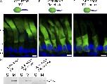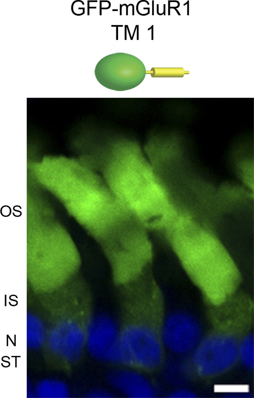 Figure 7. Localization of a random GFP-tagged transmembrane domain in transgenic Xenopus rods. GFP-tagged transmembrane segment 1 from mGluR1. Bar, 5 μm.