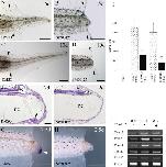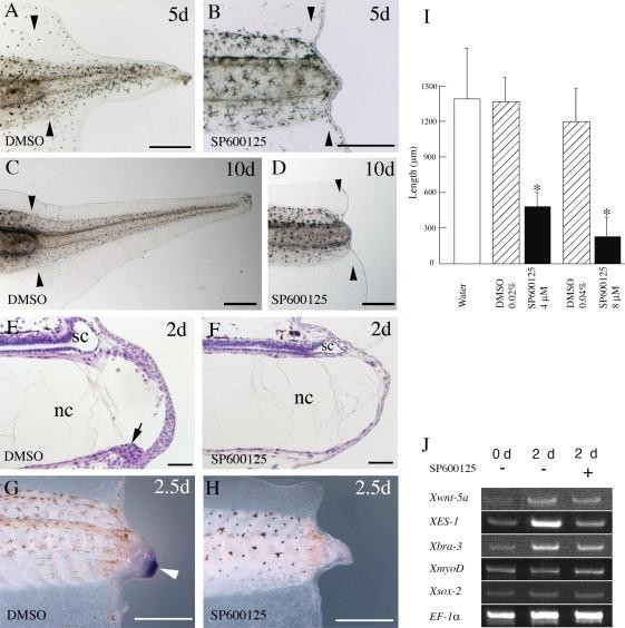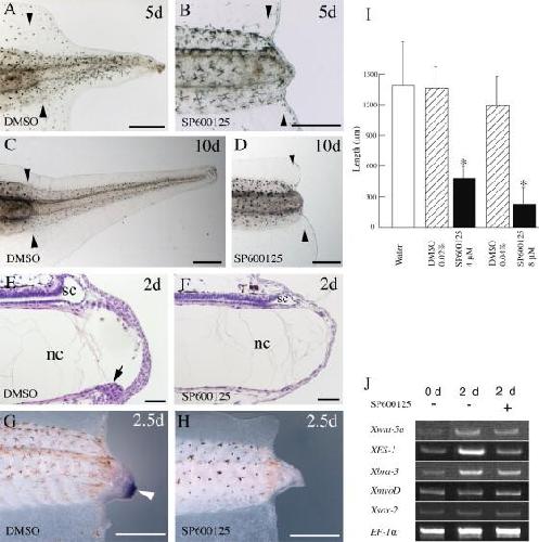 Fig. 5. Effect of JNK inhibitor on tail regeneration. (AâH) Tail-amputated tadpole was incubated in water containing 8 μM JNK inhibitor SP600125 (B, D, F and H) or in control water containing DMSO (A, C, E and G). (E and F) Sections stained with hematoxylin and eosin. (G and H) Whole-mount in situ hybridization for Xes1. Arrowheads in (AâD) show amputation planes. Arrow in (E) indicates notochord precursor cells. White arrowhead in (G) indicates positive signal for Xes1 expression. All specimens are lateral view, anterior to the left. sc, spinal cord; nc, notochord. Scale bars in (AâD, G and H) 500 μm; (E and F) 50 μm. (I) The mean length of the regenerated tails was determined on day 5 and is indicated with the standard deviation. *P value determined with Studentâs t test is less than 0.000001. (J) RNA was isolated from the amputated tail on day 0, and from the tail amputated and treated with SP600125 (8 μM) or DMSO for two days, and used for RT-PCR analysis.